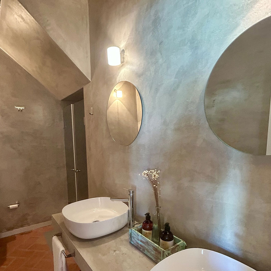 As madeiras, o metal, os acabamentos toscos, as paredes de tijolo à vista contribuem para uma harmonia muito delicada que asseguram uma atmosfera fresca e um conforto que nos faz reviver tempos antigos.